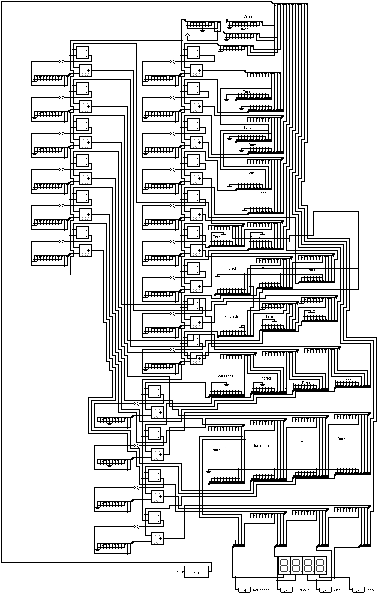 Since a standard hex display would be user-unfriendly, I engineered a 12-bit to Binary Coded Decimal (BCD) converter. This module uses a cascaded series of Add-3 (Double Dabble) algorithms to shift binary values into Ones, Tens, Hundreds, and Thousands columns.