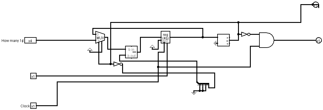 The heart of the machine is the money handling logic. I implemented a cumulative adder that takes single pulse inputs from coin slots (1¢ to $20) and adds them to a running 12-bit register.